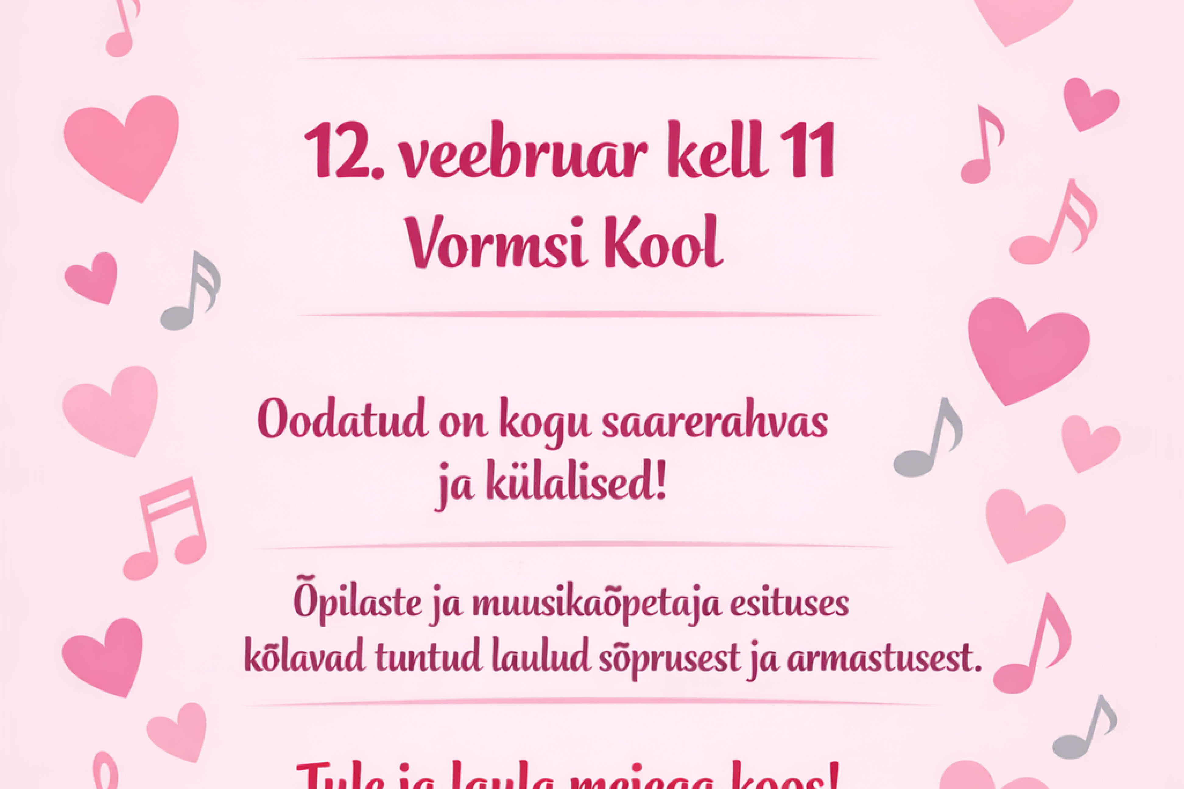 Asukoht Koolimaja, kell 11 Ava foto Vaata rohkem sündmusi Ava foto Avaldatud 28.01.2026. Viimati muudetud 28.01.2026.